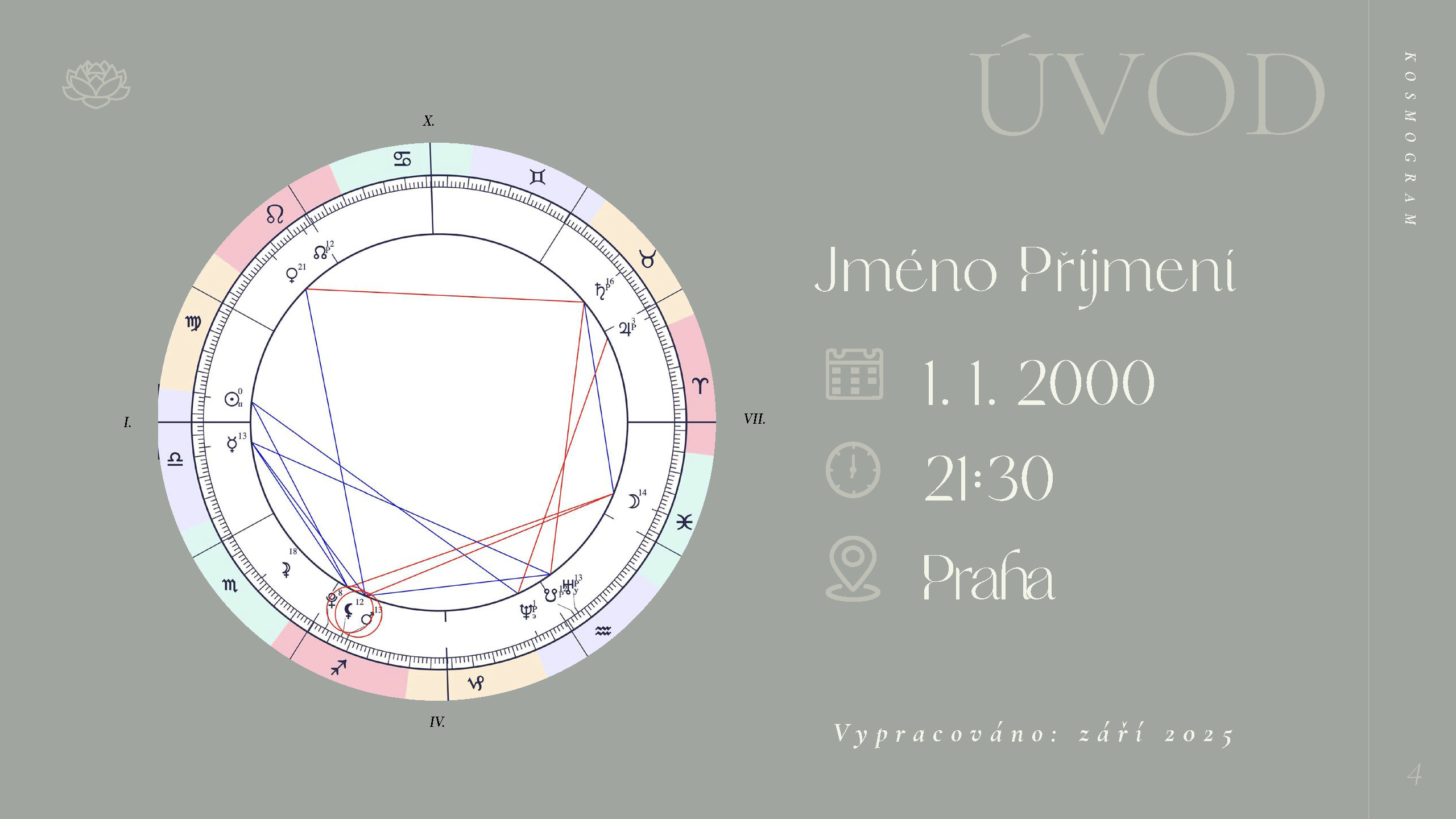 Text a podklady, které dostanete, vychází z obecně platných astrologických zákonitostí, které rozebírám na základě spolehlivých profesionálních efemeridů (programy, kde se stahují údaje o vesmírných tělesech pro vygenerování kosmogramu). Je to ale navíc má subjektivní profesionální interpretace teoretických znalostí (vycházím z tradice západní astrologie), které jsem studovala, a praktických zkušeností. Popis je obohacený o intuitivní vhledy, které vytvářejí jedinečný popis o vás, který není nikde okopírovaný nebo který by psala umělá inteligence. A to protože mi záleží na osobním přístupu, který k vám chci mít. Každý profil je tvořen na míru a poskytuje praktické informace, jak propracovávat „těžké energie“. To jsou informace individuální, vztažené pouze ke klientovi, tudíž je lze těžko najít v online horoskopu zdarma.