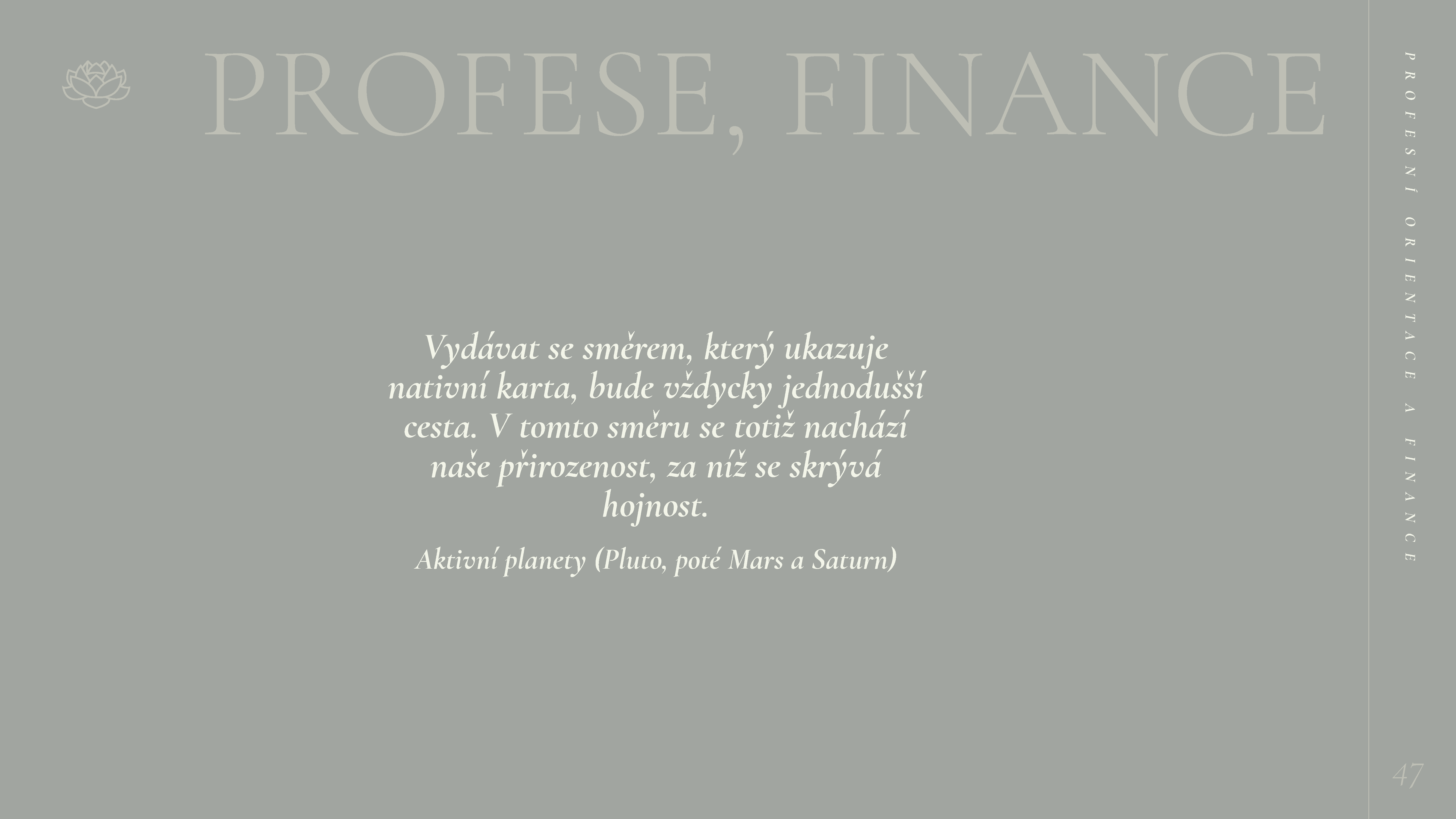 Podrobný rozbor pracovních, profesních a finančních sfér. Zjistíte, k jakým profesím přirozeně inklinujete a máte v nich hojnost a v jaké sféře byste se v tomto životě měli realizovat. Rozkryji vám, skrze co vám budou v životě chodit peníze a kde, v jakých činnostech, máte ukryté velké finance/obnosy.